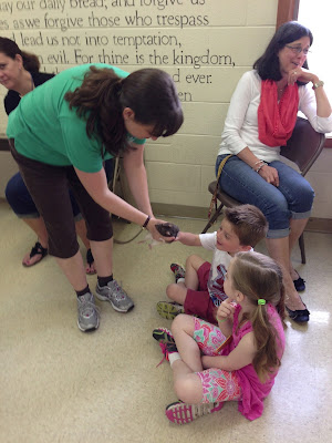 At Chase's preschool, I thought it was going to be a cute animal show in tell, but apparently, the nature lady brought rats, snakes, cochroach, and a frog. My boys were in heaven, Coco did not want to touch any of it, but she did pet the rat.